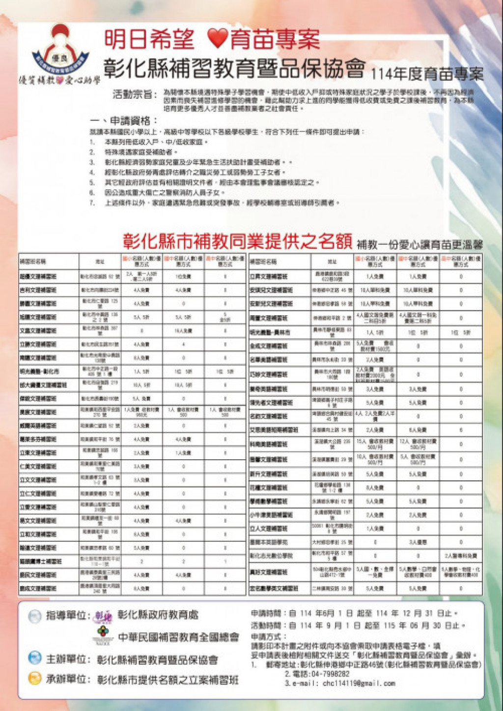 三、參與「育苗專案」之補習班名單於統整過後,會依照補習班所在行政區、補習班類型、補習班各科目提供名額數目等資料公告於『彰化縣補教協會Facebook』