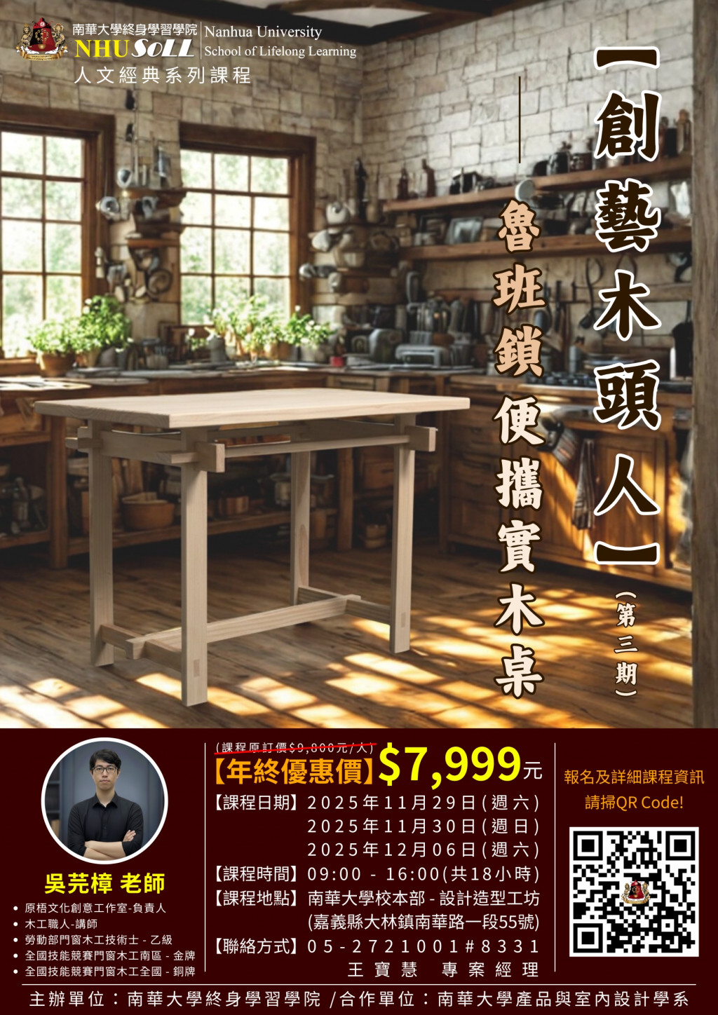 轉知南華大學114年11-12月份開辦之【創藝木頭人】(第三期):魯班鎖便擕實木桌課程資訊